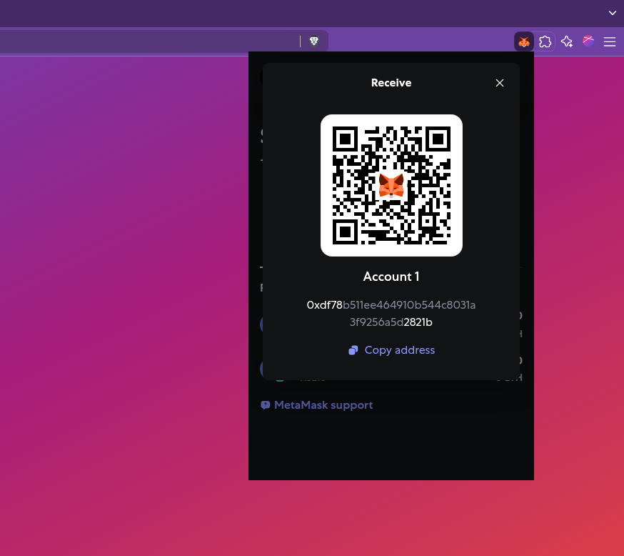 MetaMask will show your account’s QR code and Ethereum address. You can either scan the QR with a mobile device or click Copy address to share it manually.